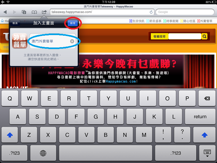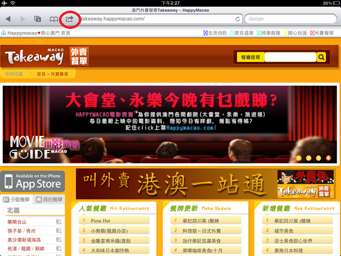 1.首先進入safari,在網址列打上takeaway.happymacao.com進入我們的網站,再點一下下圖紅圈所示的"匯出"鍵。