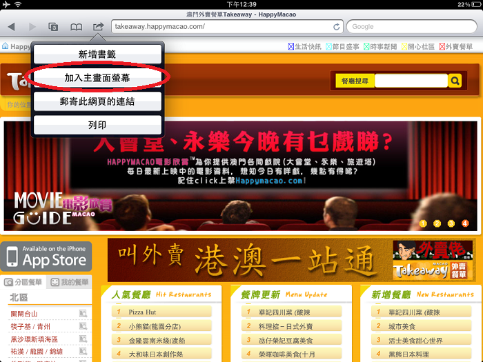 至於iPad因螢幕較大,暫時建議iPad的用戶連上網頁觀看,以下是一個方法可以將網頁版的外賣餐單放上iPad的桌面,以便大家可以更快的叫外賣。
